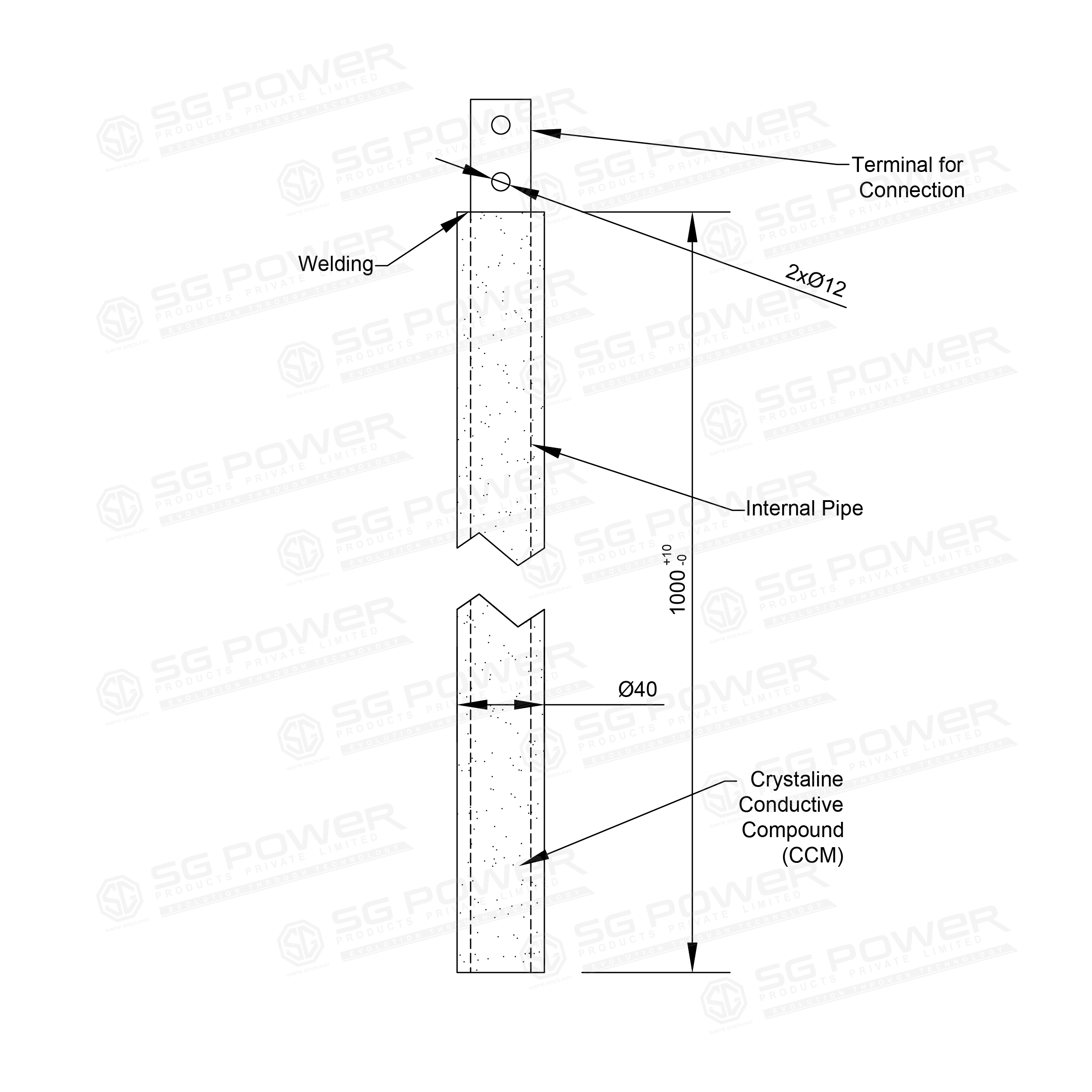 TRUESAFE™ Chemical Earthing manufactured by SG Power Products Pvt. Ltd. is a high-quality GI Electrode designed for reliable electrical grounding and earthing systems. The electrode features a 40 mm diameter with Class B pipe thickness and a total length of 1 metre. It is supplied with a 25x5x75 mm terminal including 10mm * 2 holes holes for secure cable connection, ensuring effective dissipation of fault current in electrical installations.