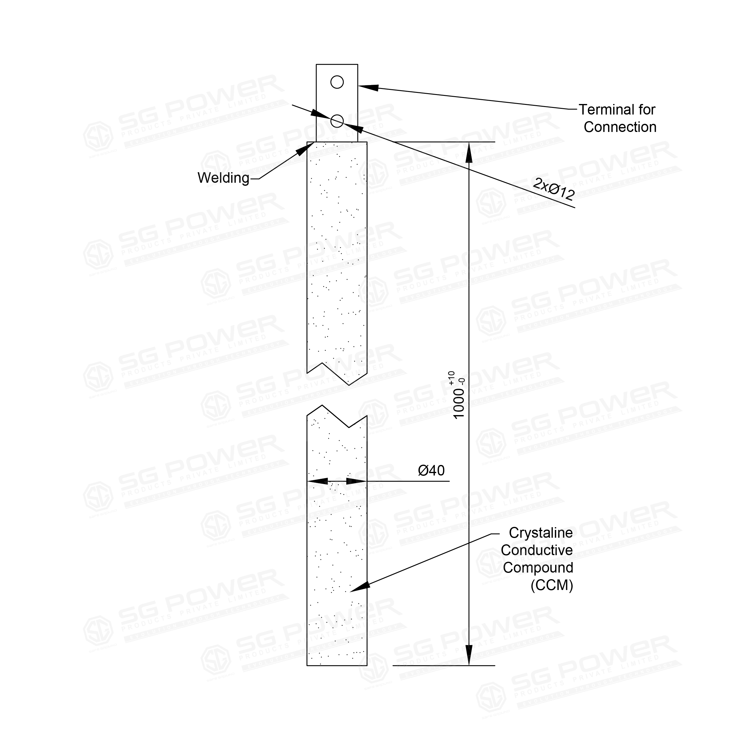 TRUESAFE™ Chemical Earthing manufactured by SG Power Products Pvt. Ltd. is a high-quality GI Electrode designed for reliable electrical grounding and earthing systems. The electrode features a 40 mm diameter with Class B pipe thickness and a total length of 1 metre. It is supplied with a 25x5x75 mm terminal including 10mm * 2 holes holes for secure cable connection, ensuring effective dissipation of fault current in electrical installations.